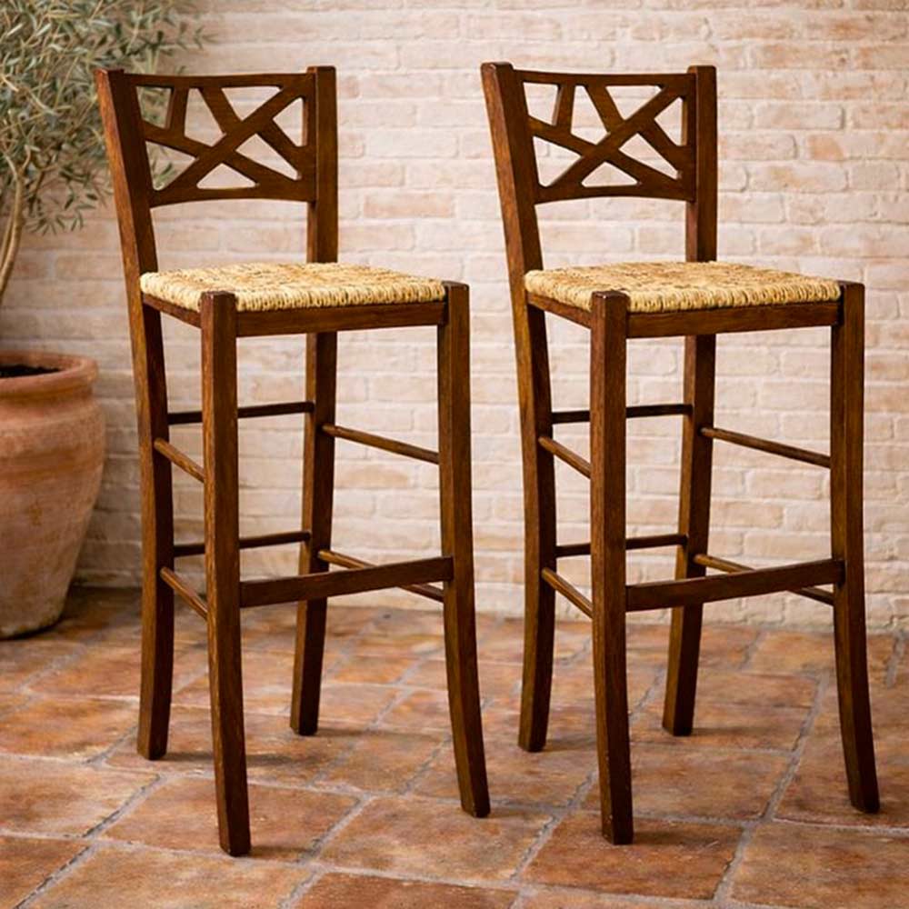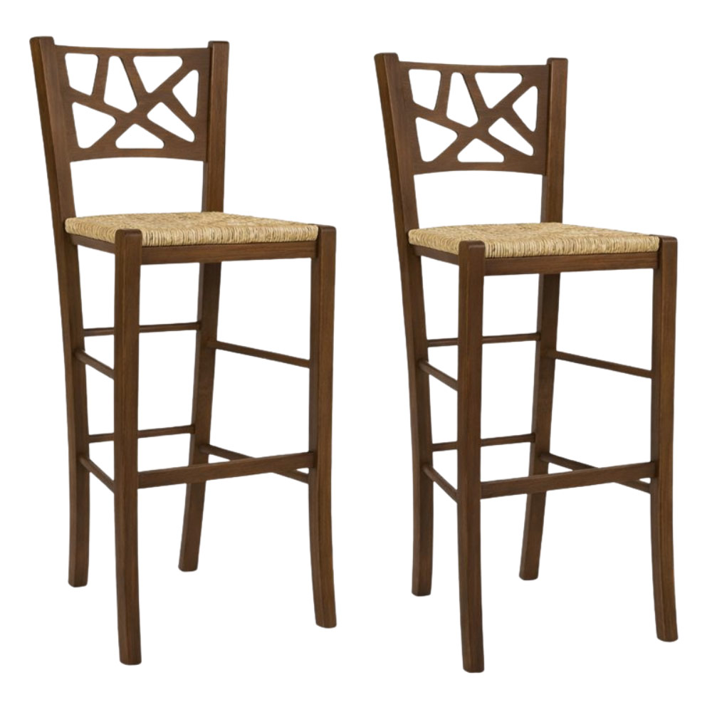 Coppia di sgabelli Sissy in legno noce scuro con seduta in paglia