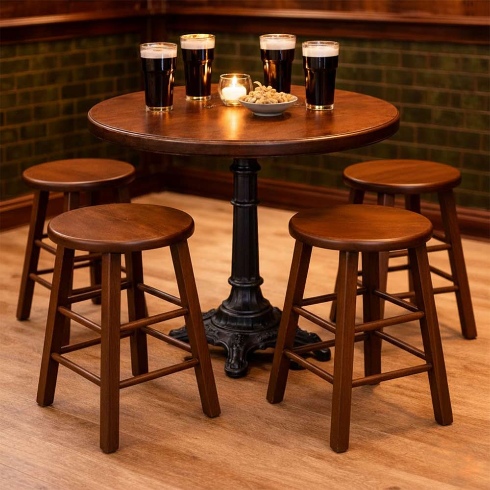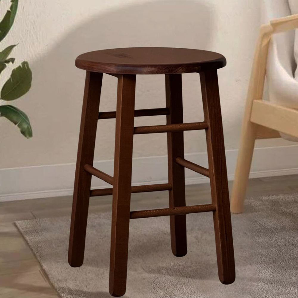 Sgabello con seduta rotonda interamente realizzato in legno massello di faggio, rifinito in elegante tinta noce scuro.