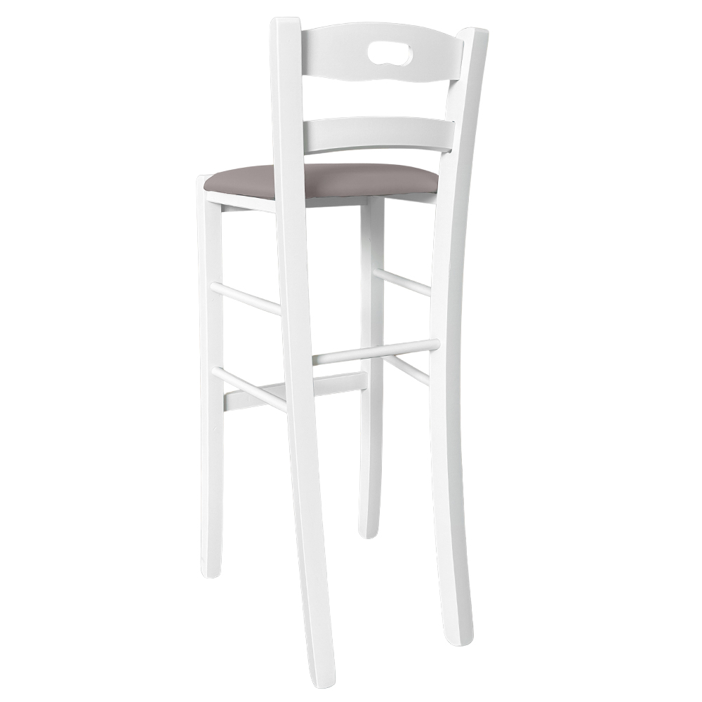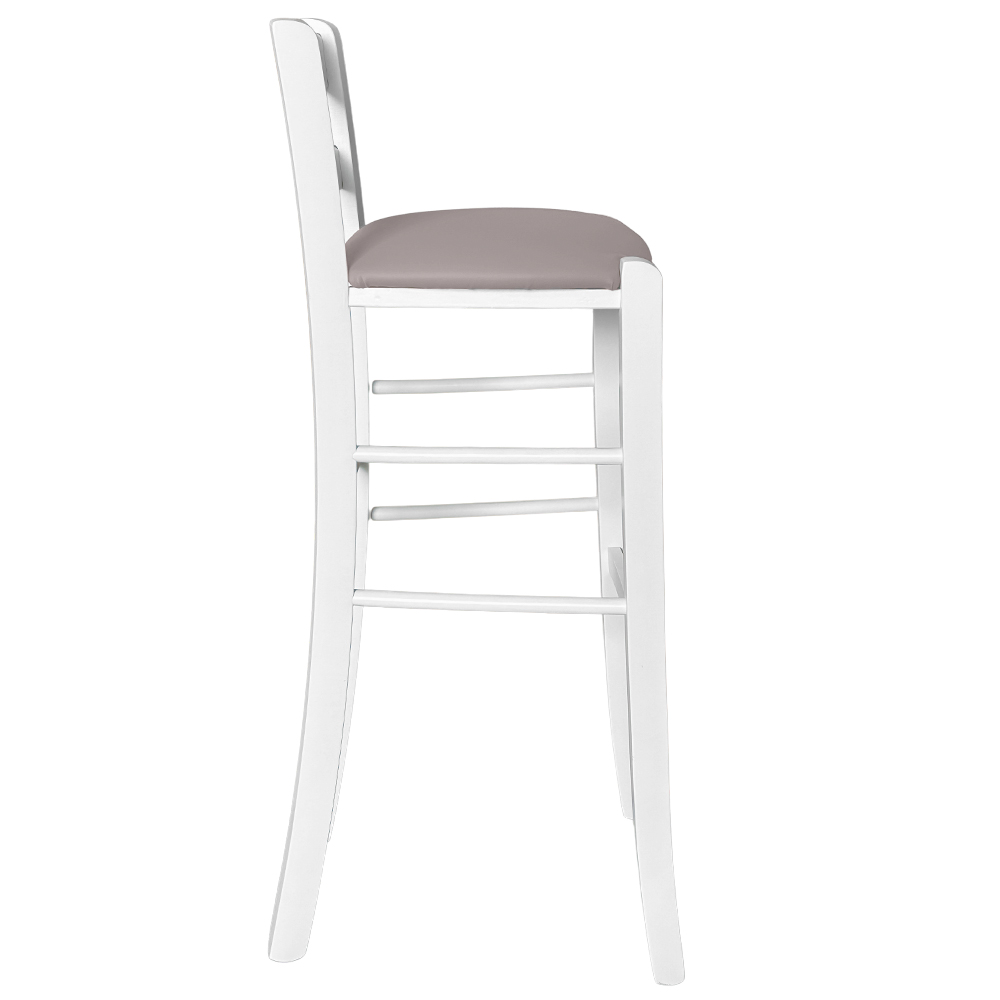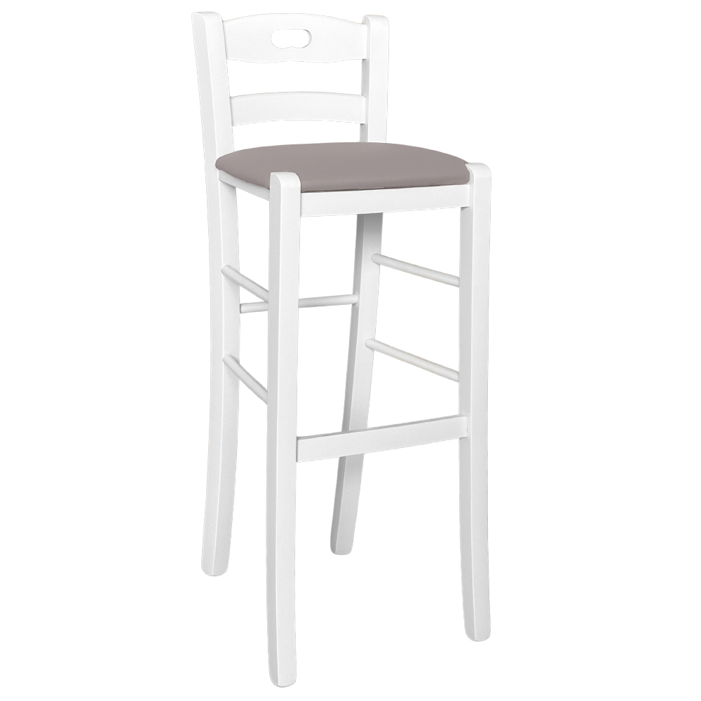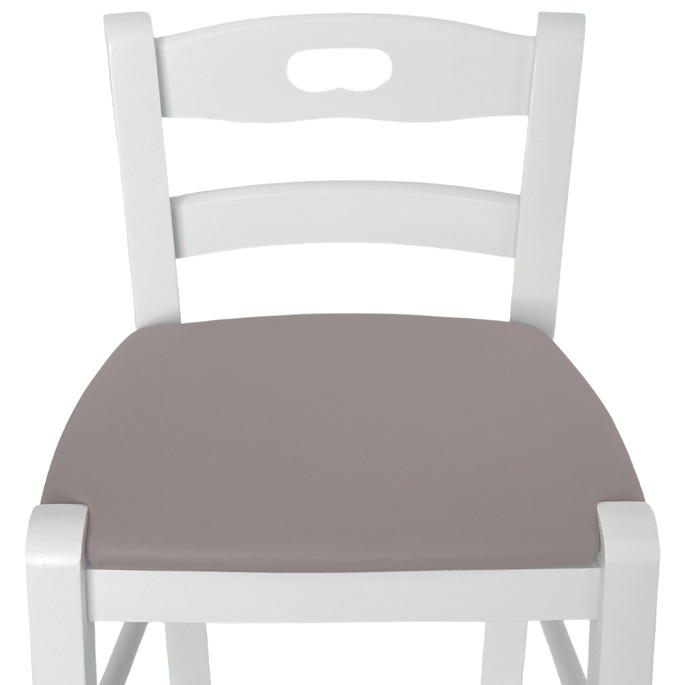Questo elegante sgabello alto unisce il calore del legno massiccio verniciato bianco alla raffinatezza della seduta rivestita in morbida similpelle color tortora.