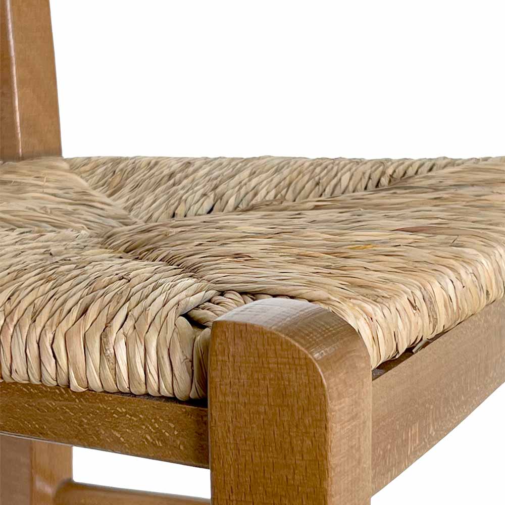 Struttura robusta in legno massello con finitura noce chiaro e seduta in paglia intrecciata a mano.