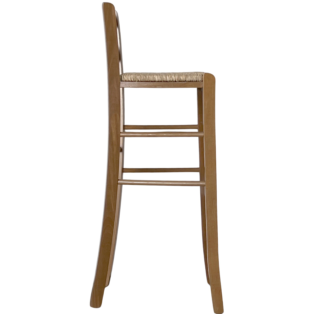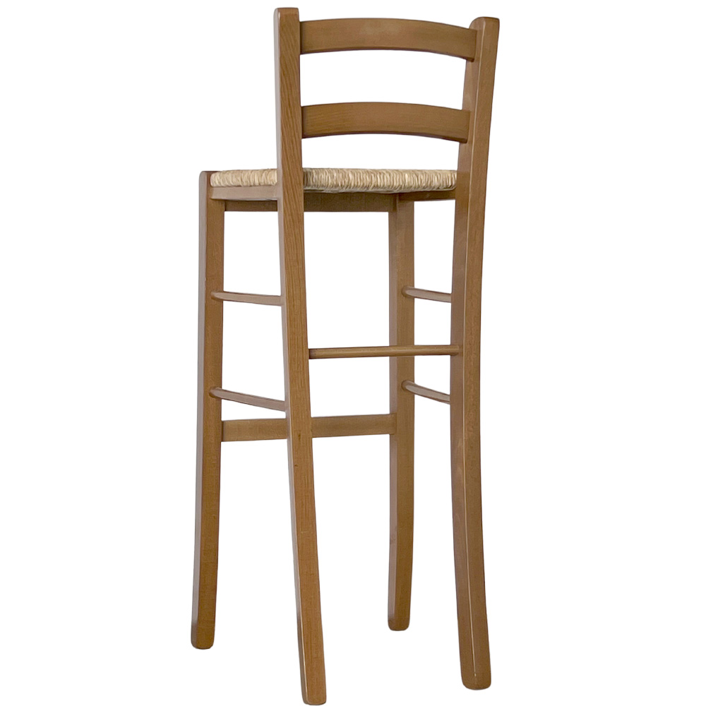 Sgabello in legno massello con elegante finitura noce chiaro e seduta in paglia intrecciata a mano.