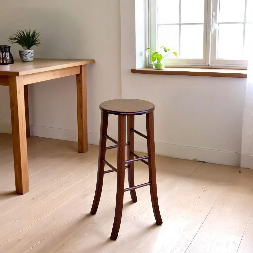 Sgabello con seduta rotonda e gambe a sciabola, realizzato interamente in legno massiccio con finitura noce scuro, altezza seduta 80 cm da terra.