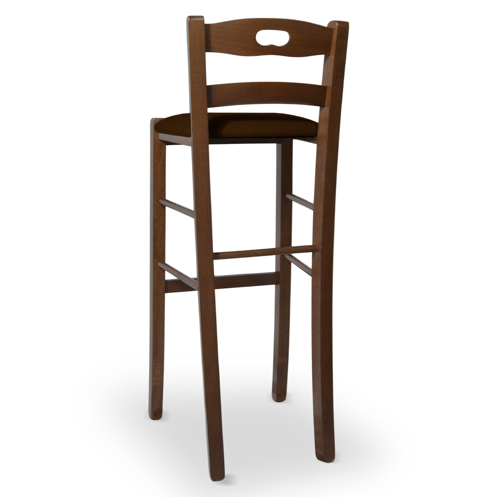 Sgabello realizzato interamente in legno di faggio italiano con finitura noce scuro, dotato di foro e seduta imbottita in similpelle marrone.