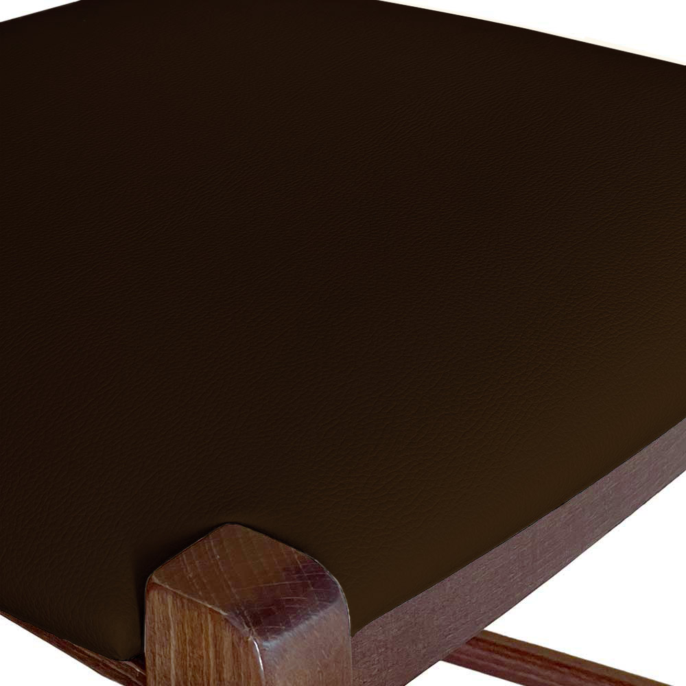 Realizzato interamente in legno di faggio italiano con finitura noce scuro e seduta imbottita in similpelle marrone.