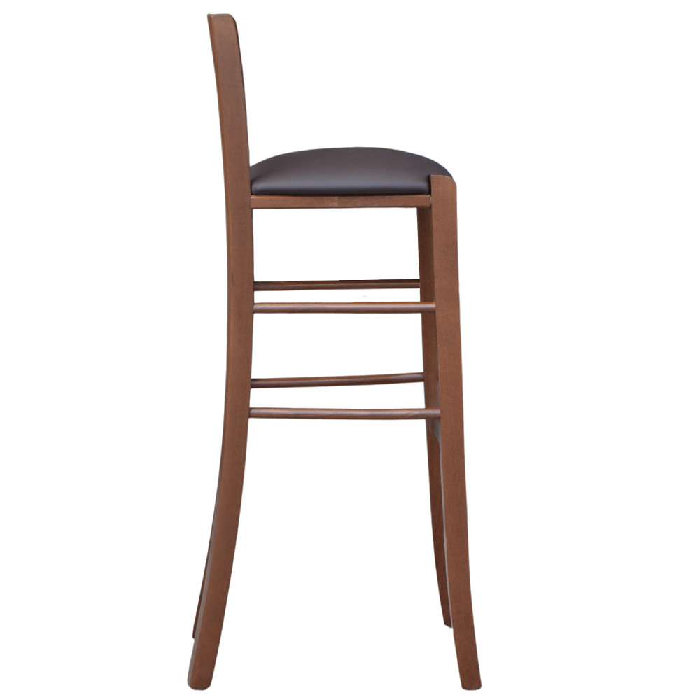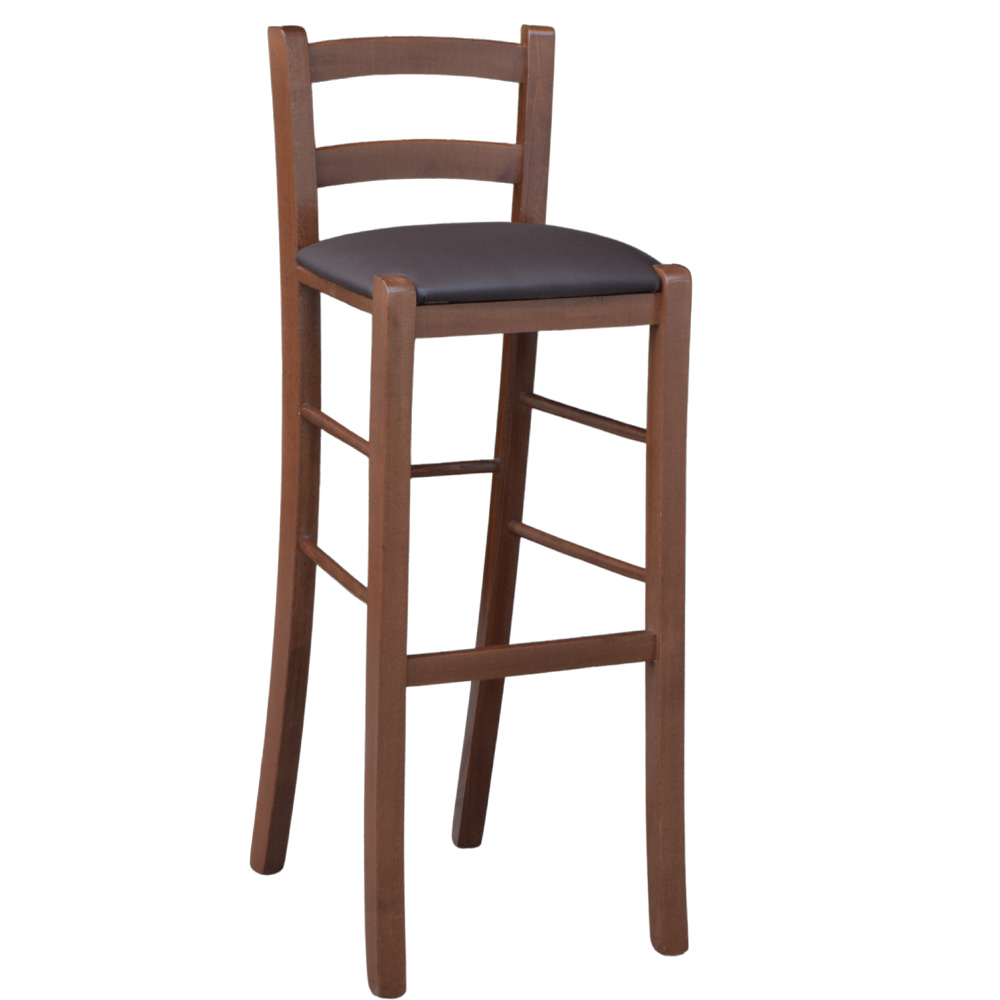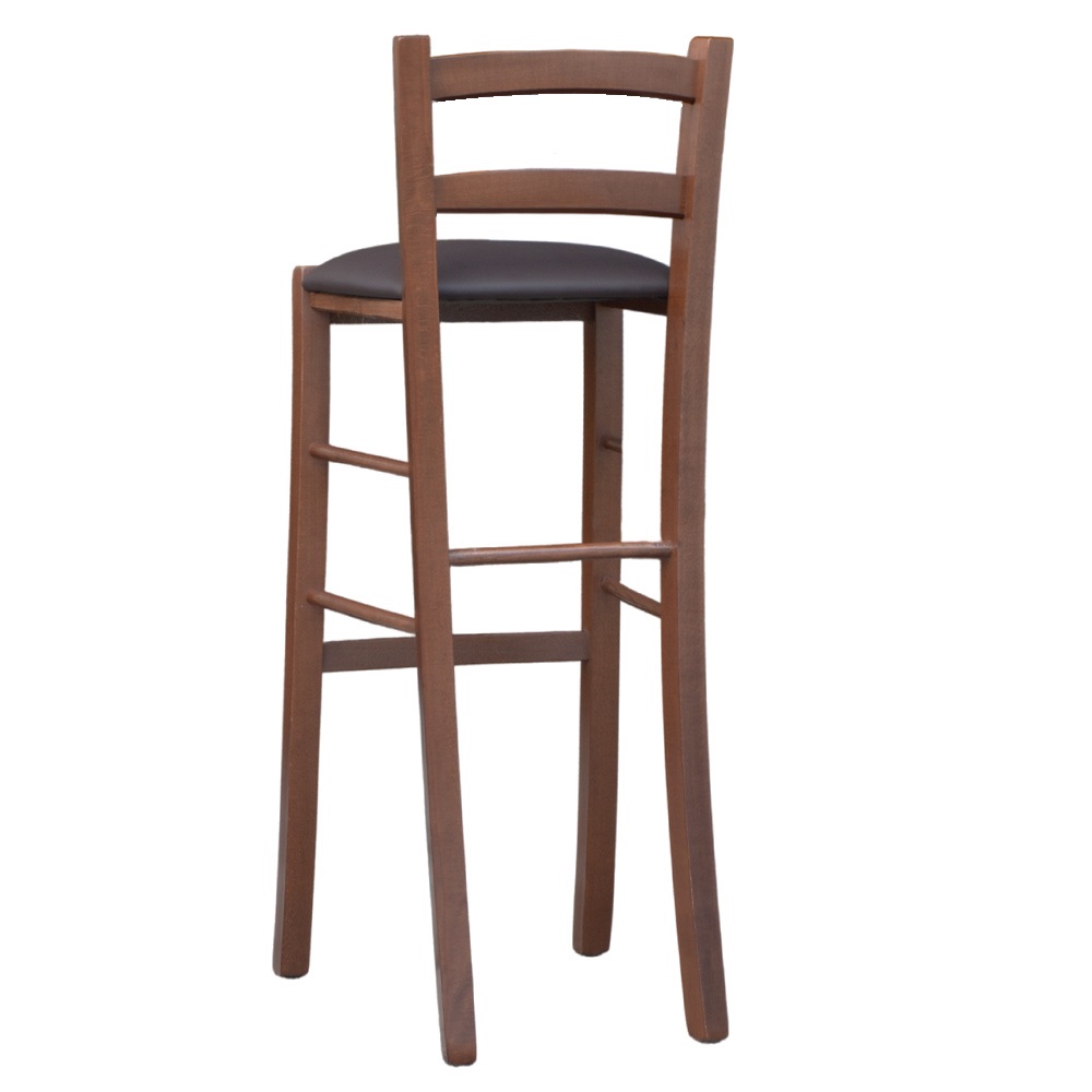 Sgabello realizzato in legno massello con finitura noce scuro, dotato di comoda seduta rivestita in similpelle marrone