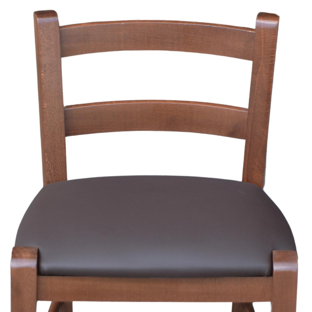 Struttura solida in legno massello noce scuro con seduta imbottita in similpelle marrone, elegante e confortevole.