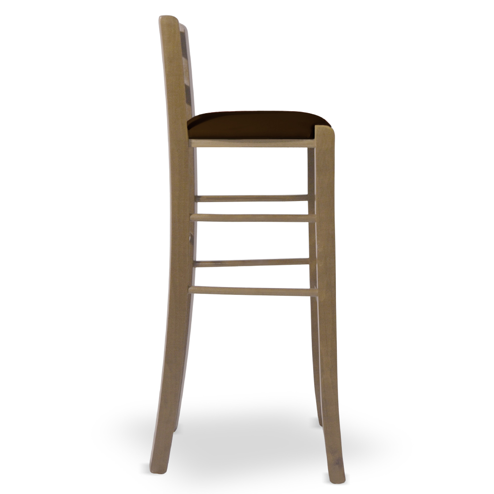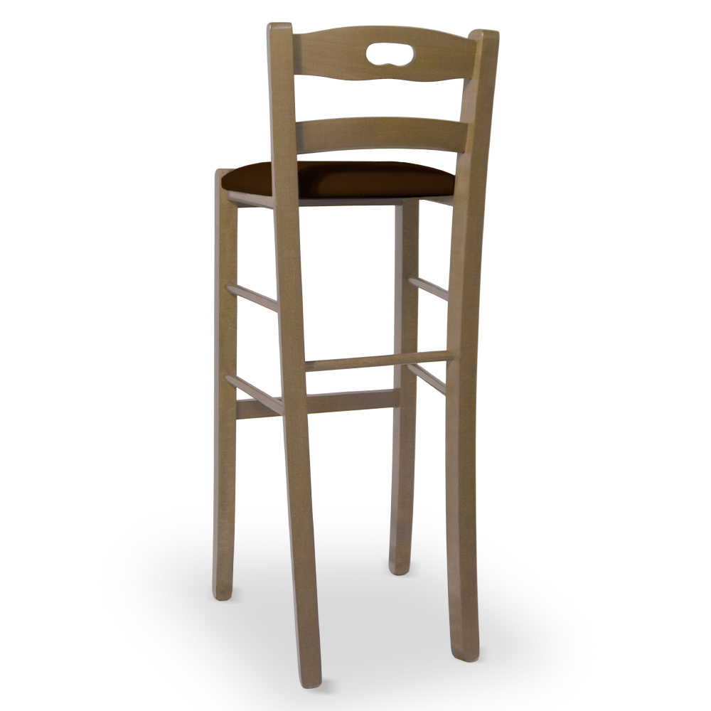 Sgabello realizzato interamente in legno di faggio italiano con finitura noce chiaro, dotato di foro e seduta imbottita in similpelle marrone.