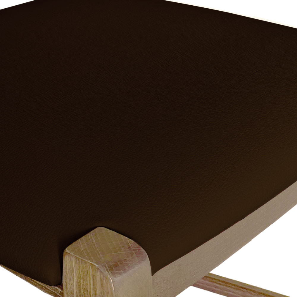 Realizzato interamente in legno di faggio italiano con finitura noce chiaro e seduta imbottita in similpelle marrone.