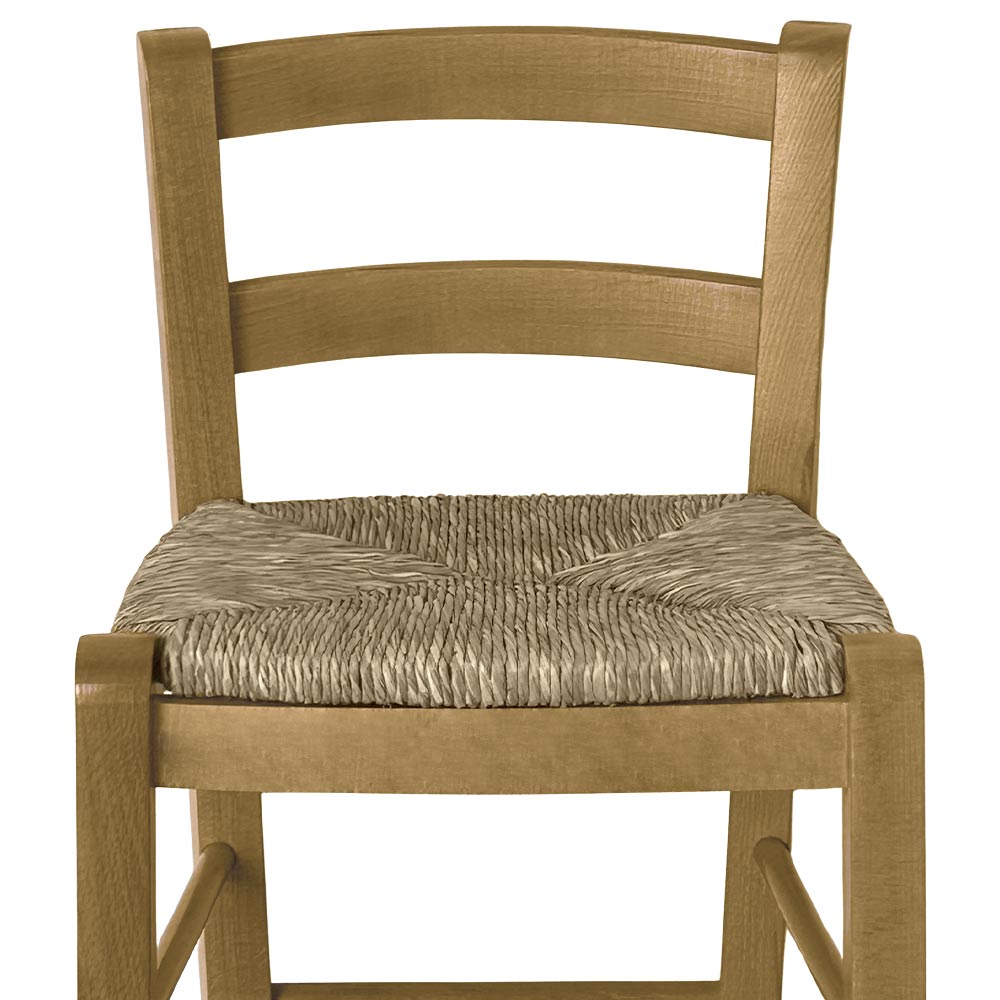 Sgabello snack con seduta in paglia, realizzato completamente in legno massello di faggio con finitura noce chiaro