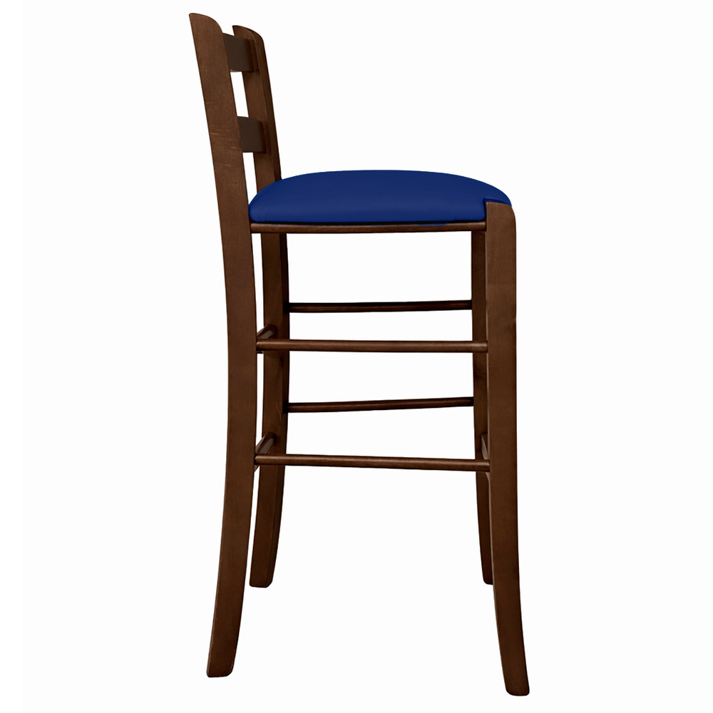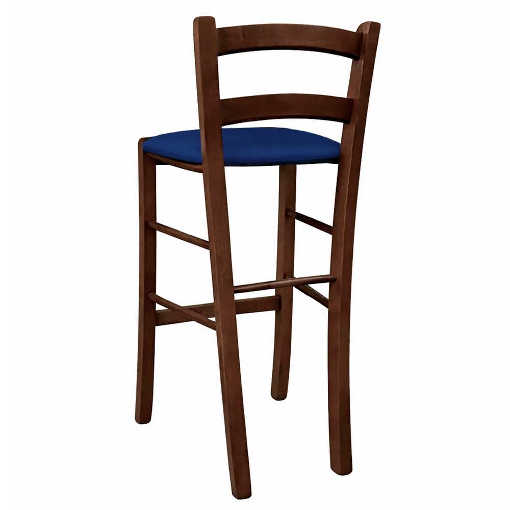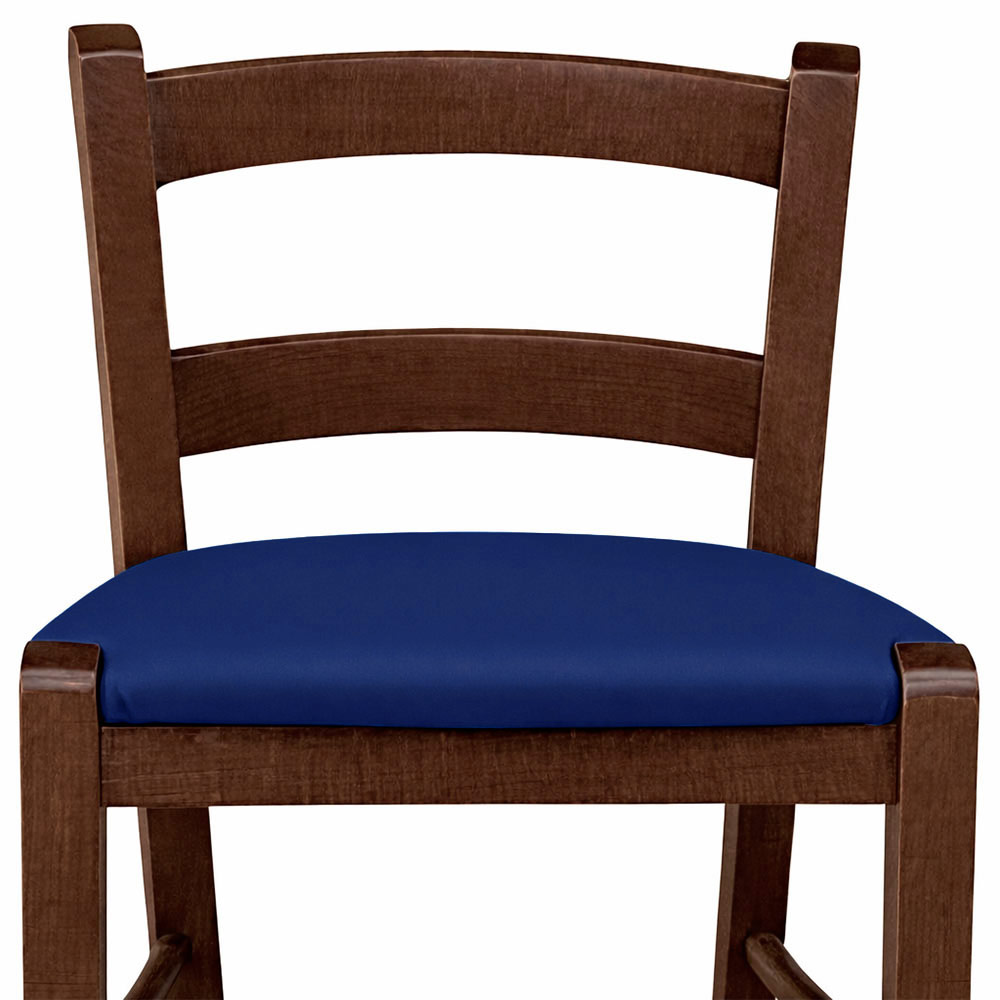 Sgabello snack in legno massello con seduta in similpelle blu e finitura noce scuro