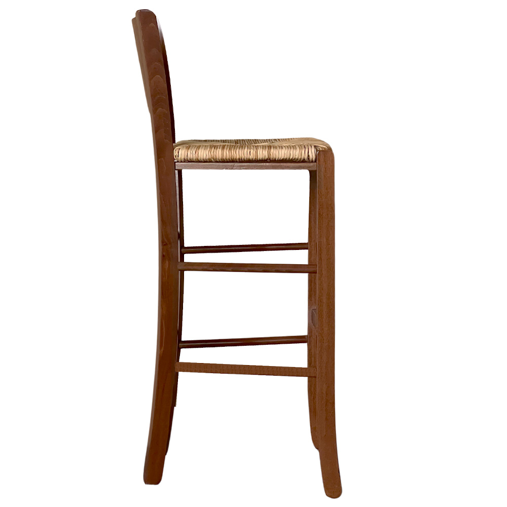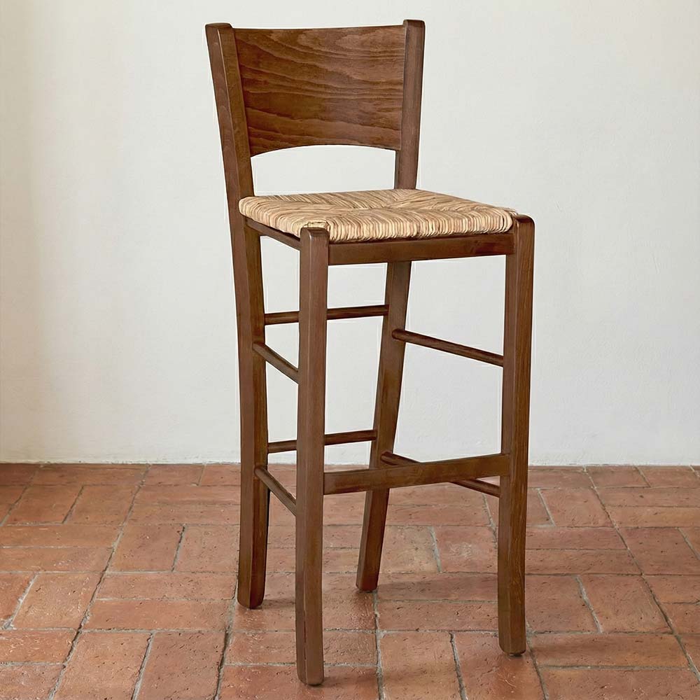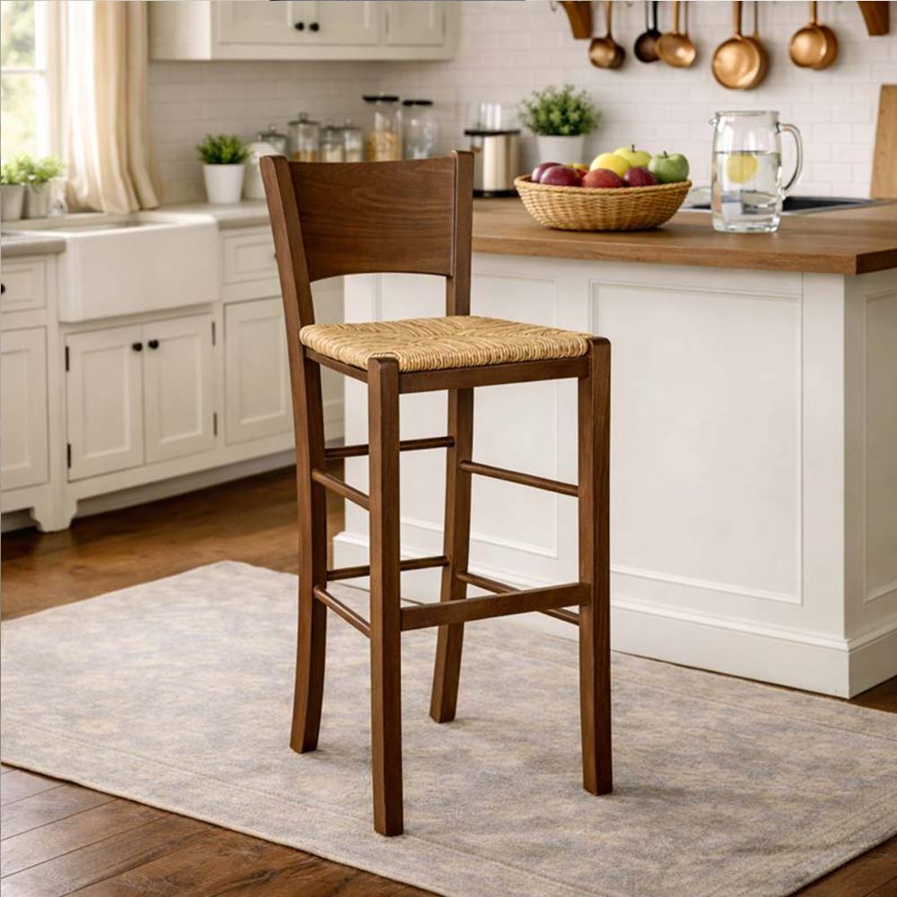 Sgabello in legno massello con finitura noce scuro e seduta in paglia intrecciata a mano.