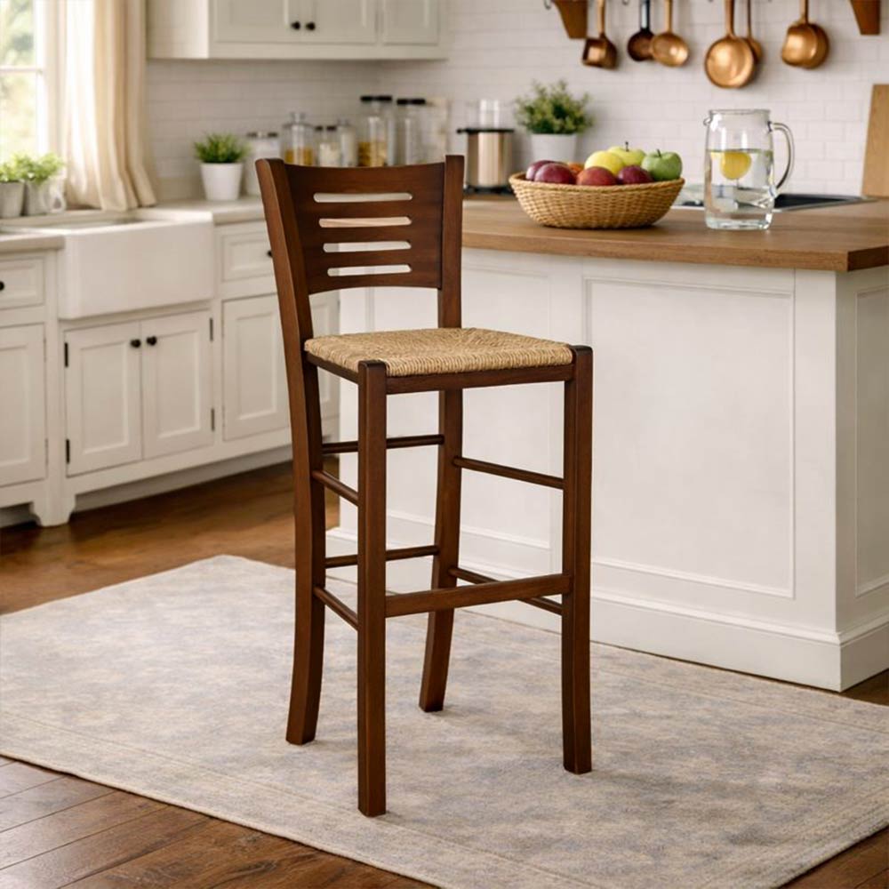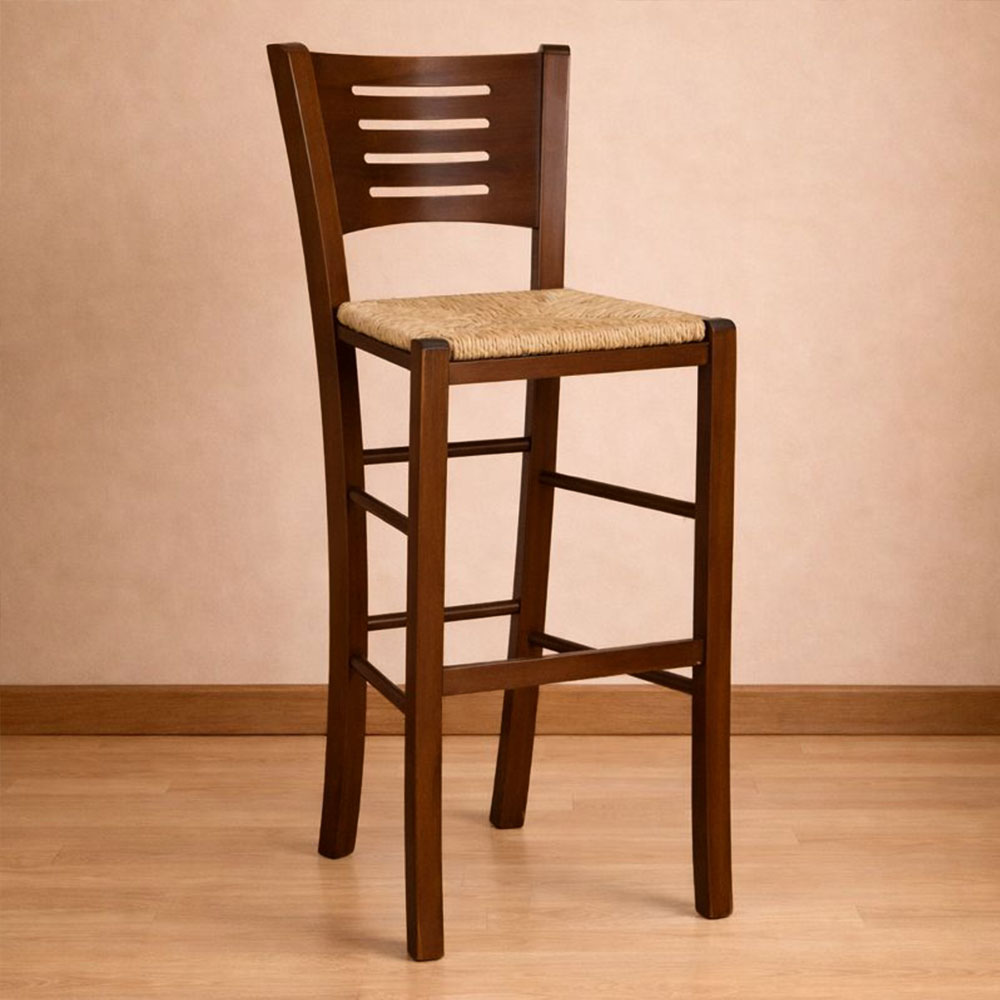 Sgabello verona in legno noce scuro con seduta in paglia