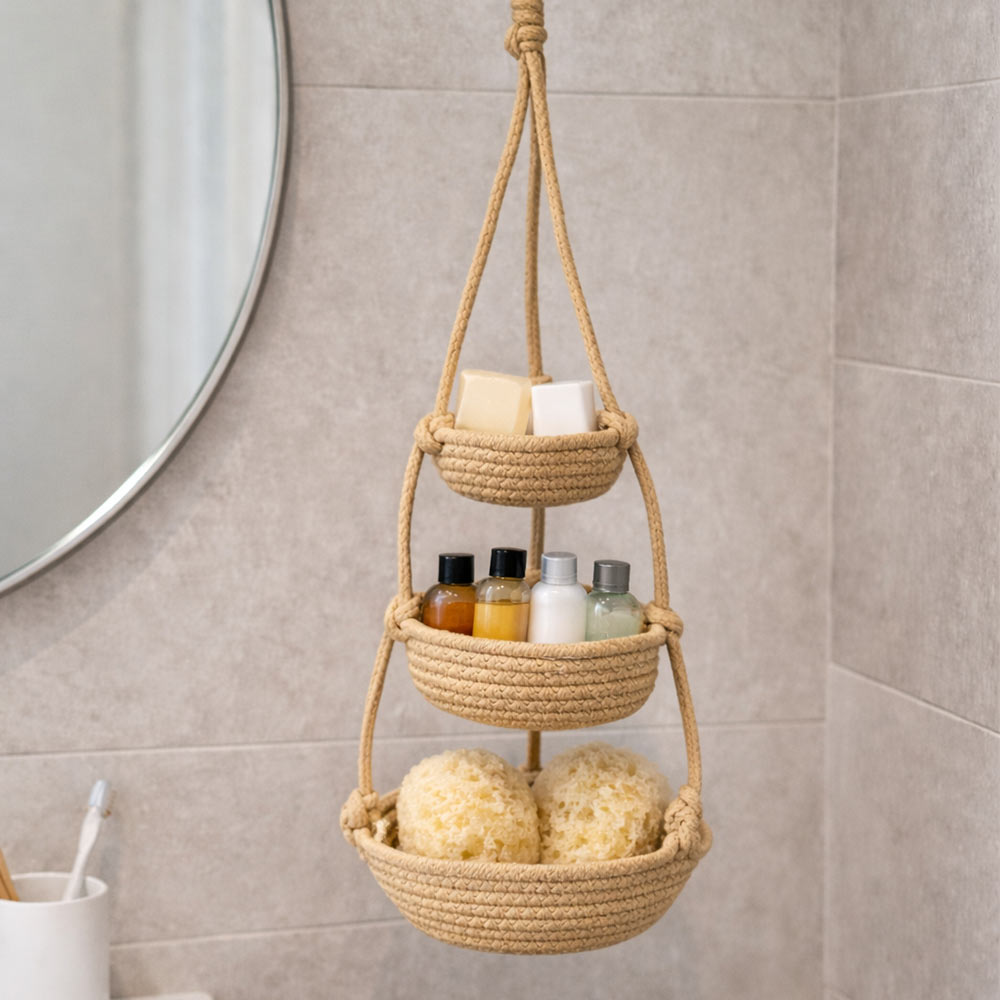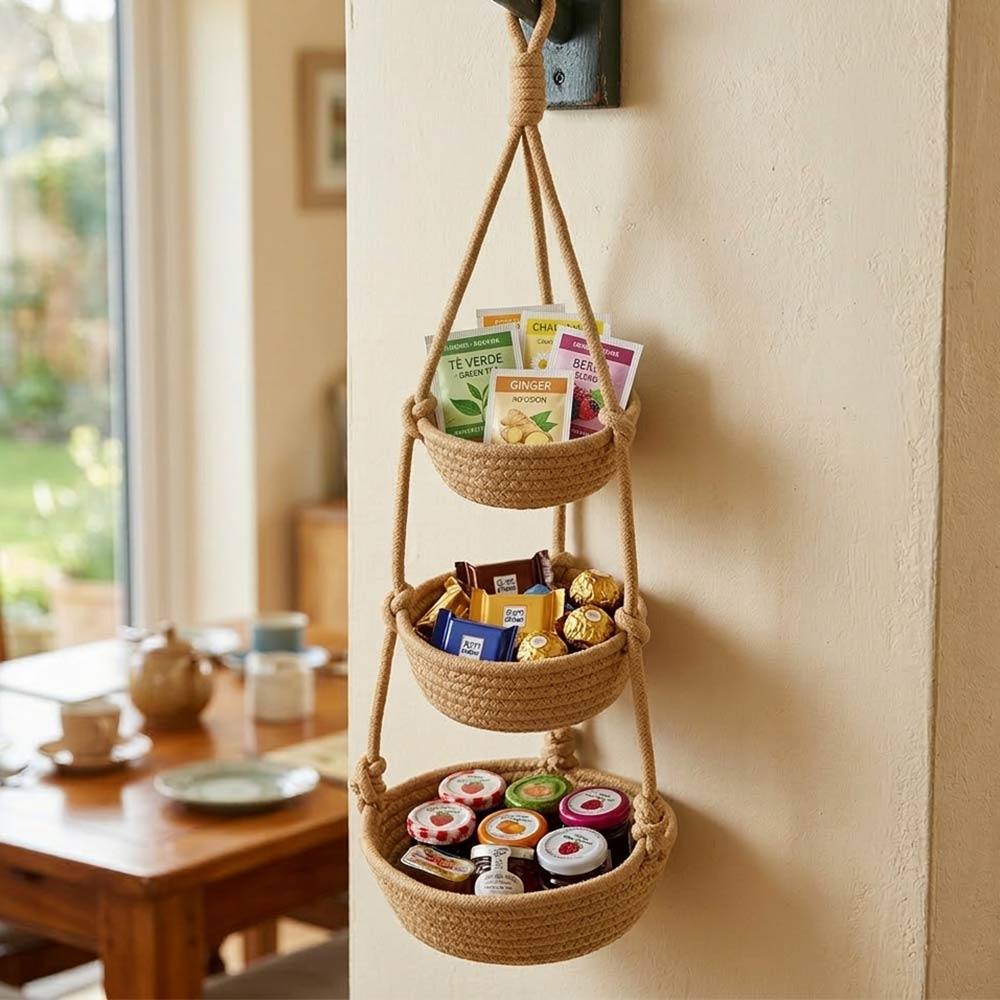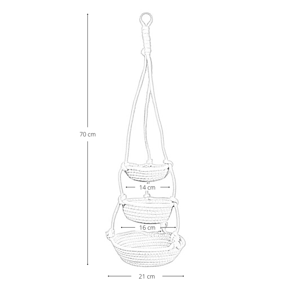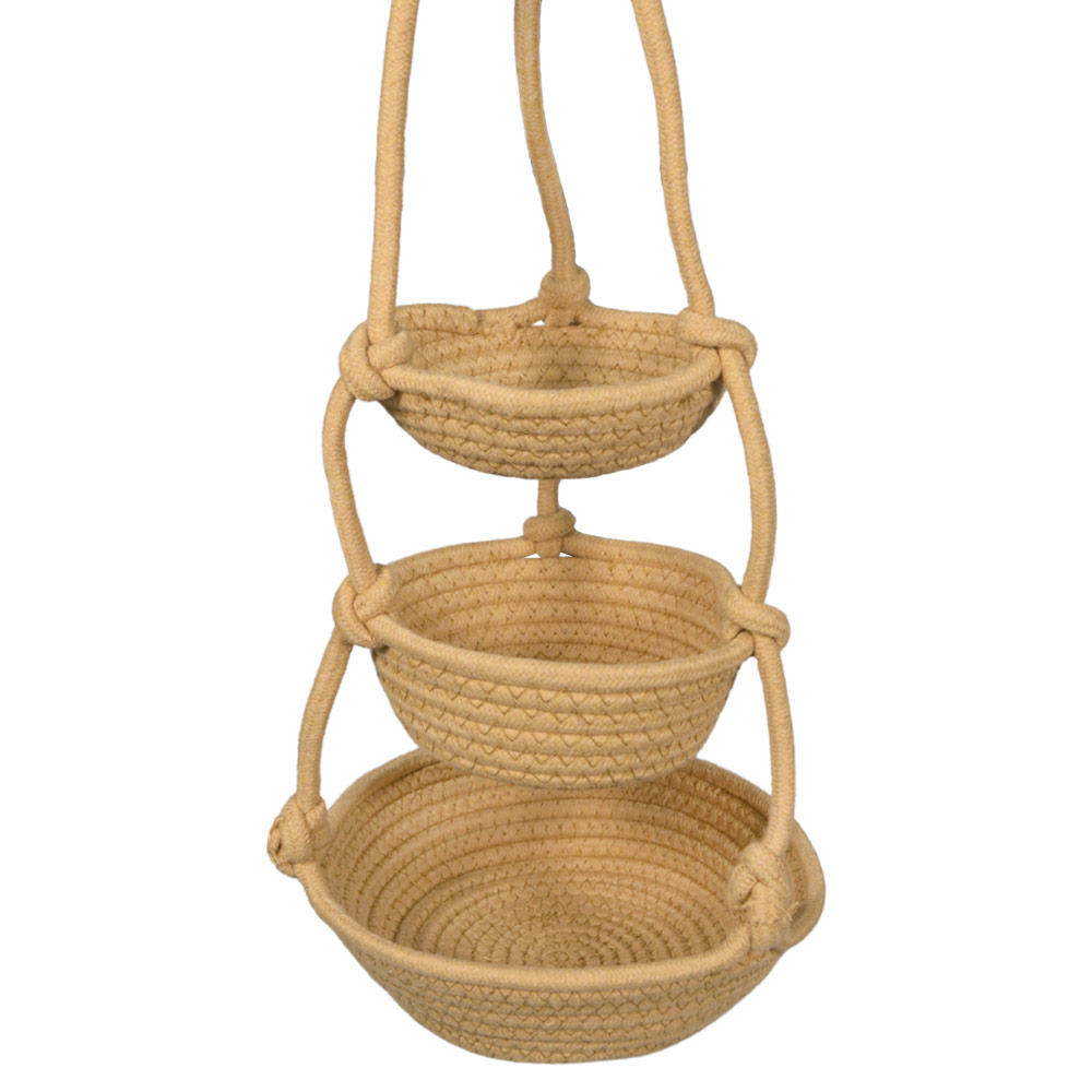 Vaso pensile decorativo a tre livelli realizzato in corda intrecciata color beige, perfetto per creare eleganti composizioni sospese e valorizzare gli spazi con uno stile naturale e armonioso.